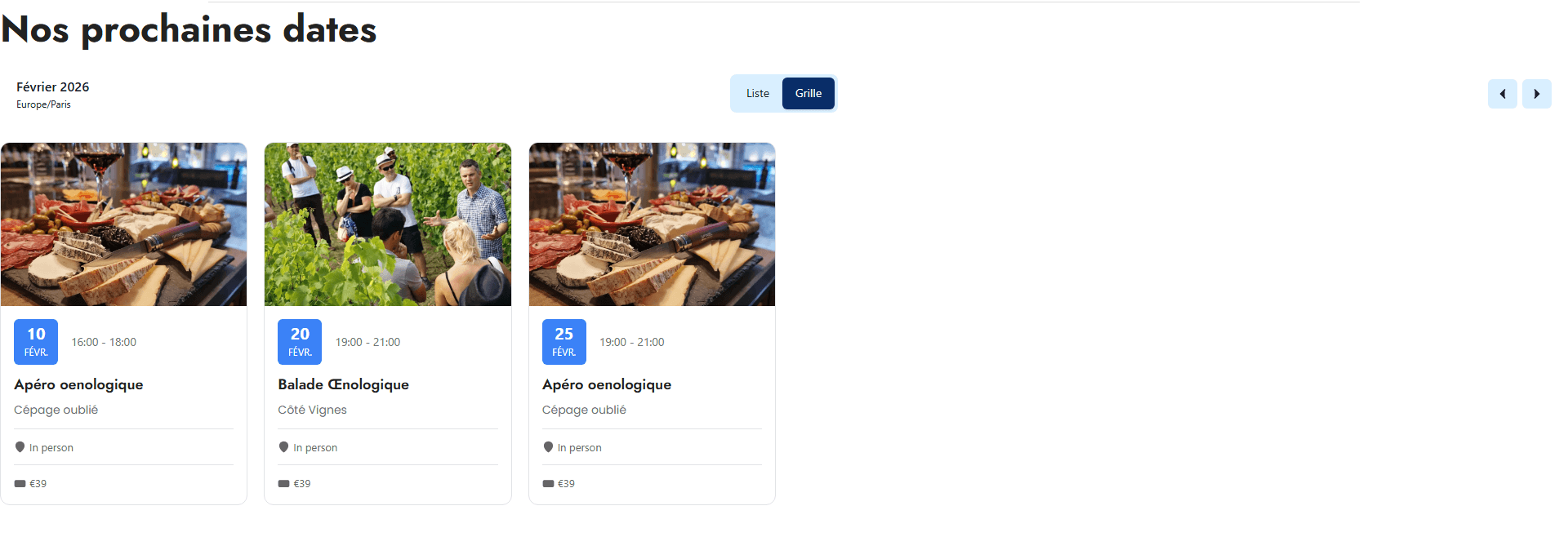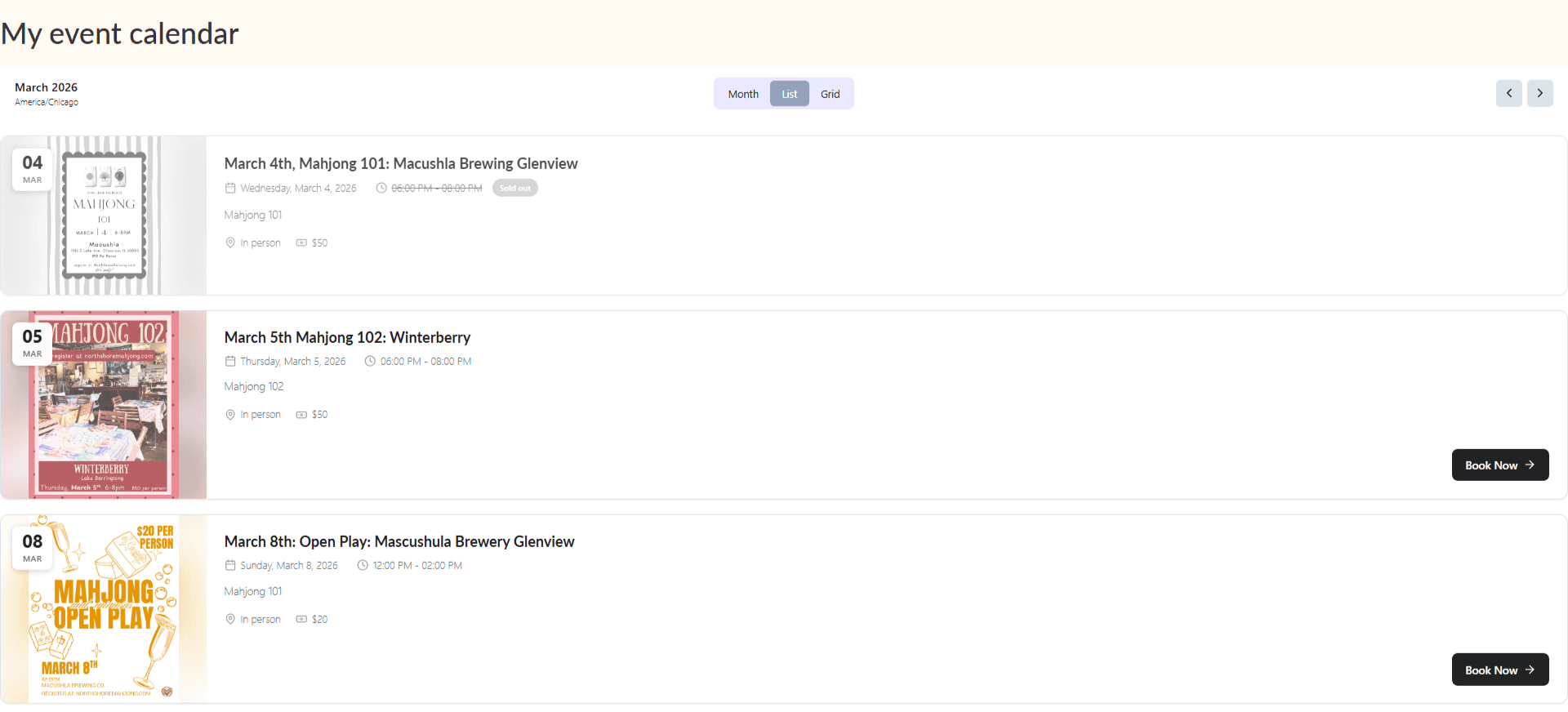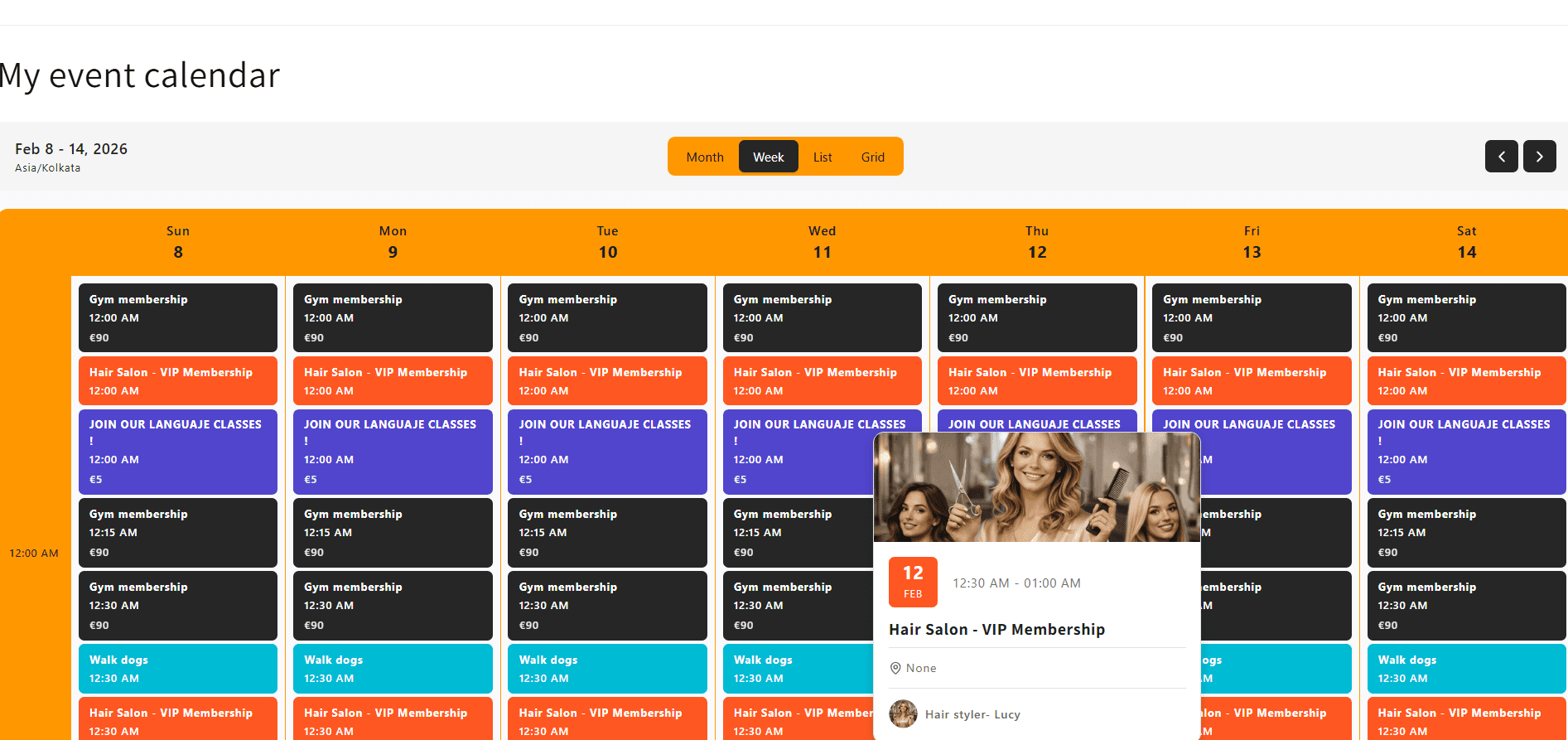 Multiple calendar views: Visitors can switch between month, week, list or grid views to browse your schedule (the list view is used on mobile by default). This flexibility means each customer sees the format they prefer.
