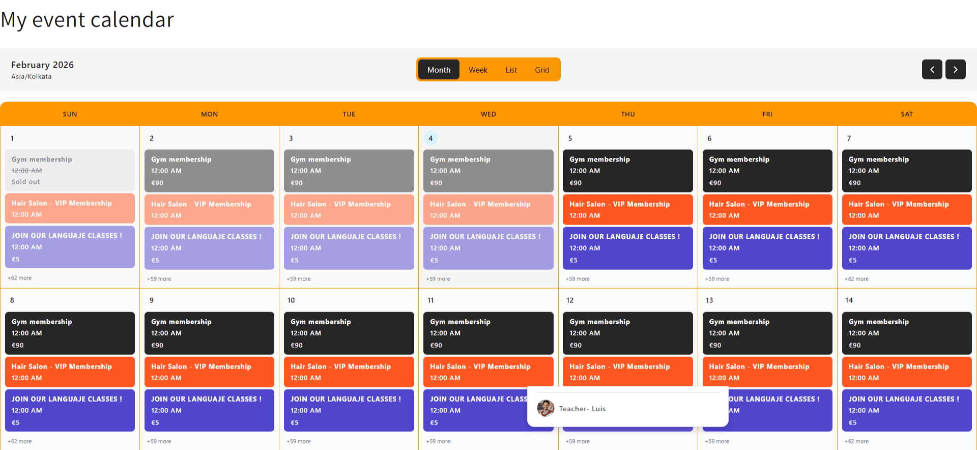 Pro tip: Enable the week and grid views for high-frequency schedules, or stick to month view for simpler event listings. On mobile, the calendar will automatically use a list view for easy scrolling.